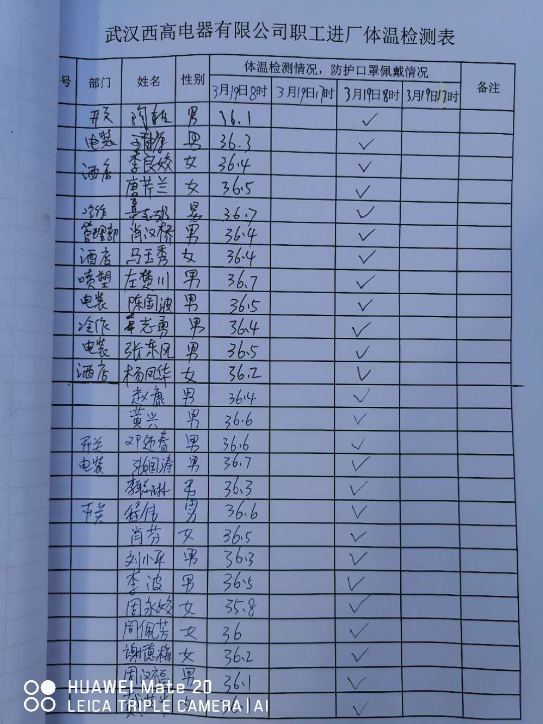 黨員同志在做好自身防護(hù)的同時(shí),不定時(shí)不定期對(duì)復(fù)工期間其他員工的防控工作進(jìn)行抽查,做好記錄備檔工作。