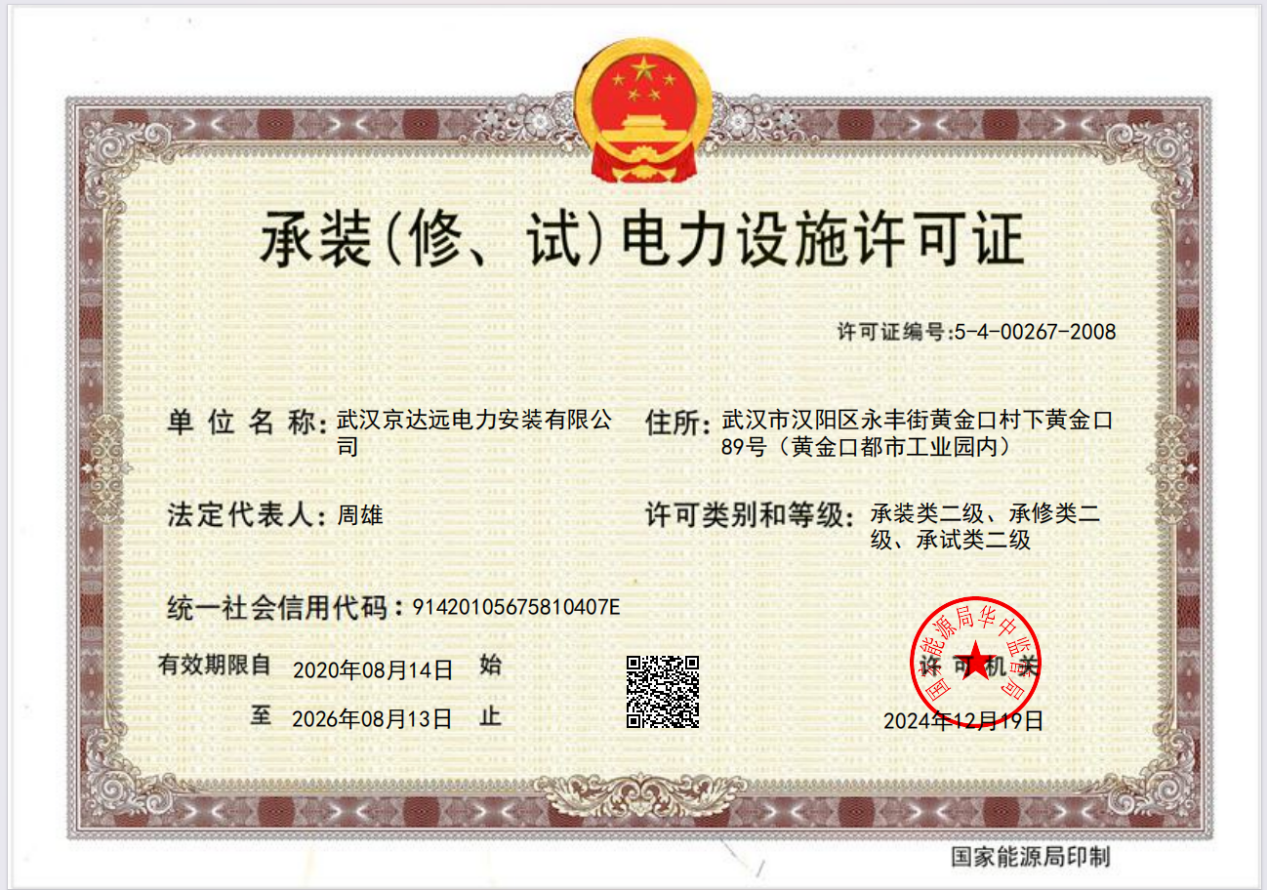 近日,根據(jù)國(guó)家能源局《承裝(修、試)電力設(shè)施許可證管理辦法》,武漢京達(dá)遠(yuǎn)電力安裝有限公司順利通過(guò)了國(guó)家能源局華中監(jiān)管局的重重審核、現(xiàn)場(chǎng)核查,公司申報(bào)的承裝(修、試)電力設(shè)施許可證-承裝類二級(jí)、承修類二級(jí)、承試類二級(jí)資質(zhì)成功獲批。